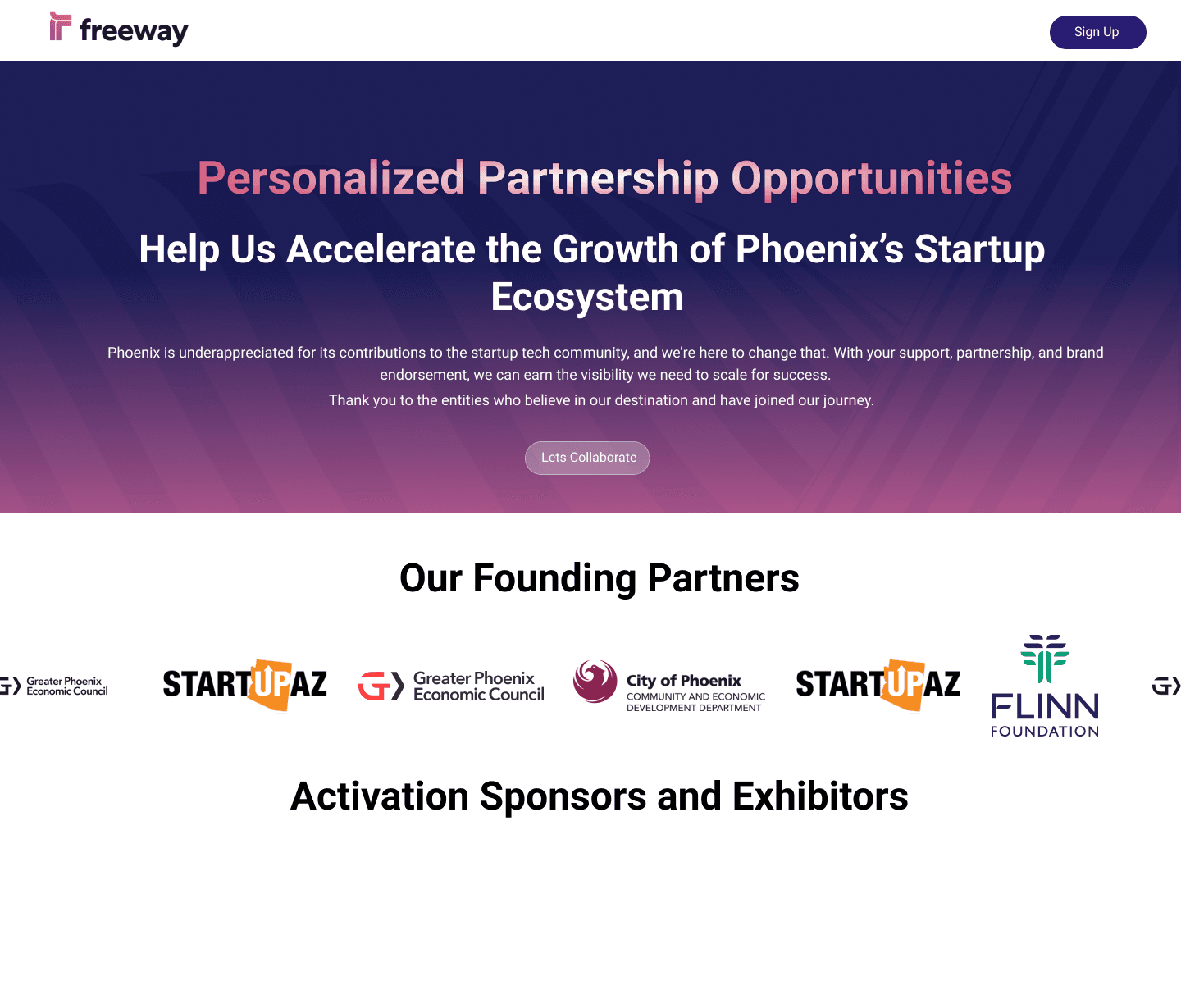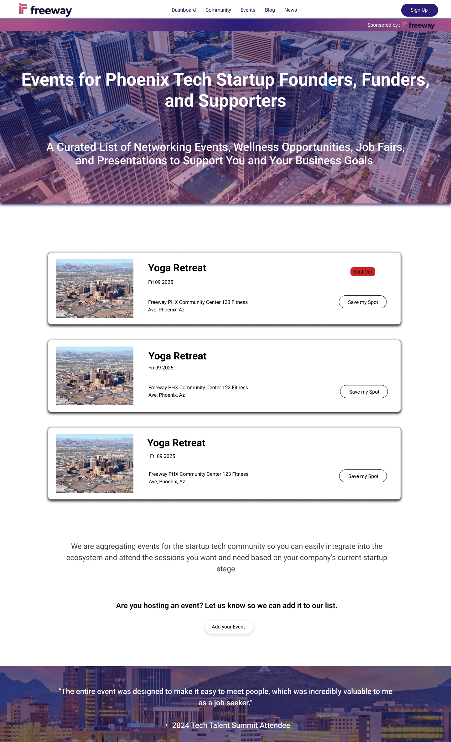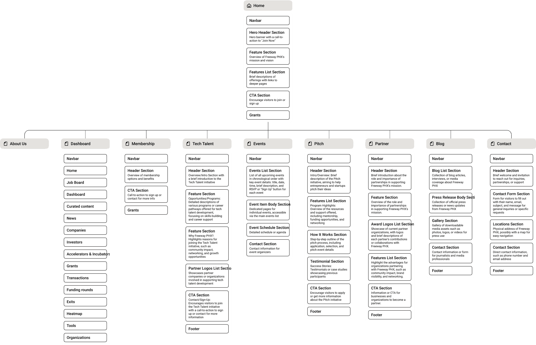 Founder of freewayPHX had a solution in mind, a flow that they already wanted to explore. At first glance, it seemed extensive and simple. We dug deeper and created a sitemap from the old design. we had to create design concepts according to these 7 pages - Home, Partners, Dashboard, News, Freeway X, About, and Events.
