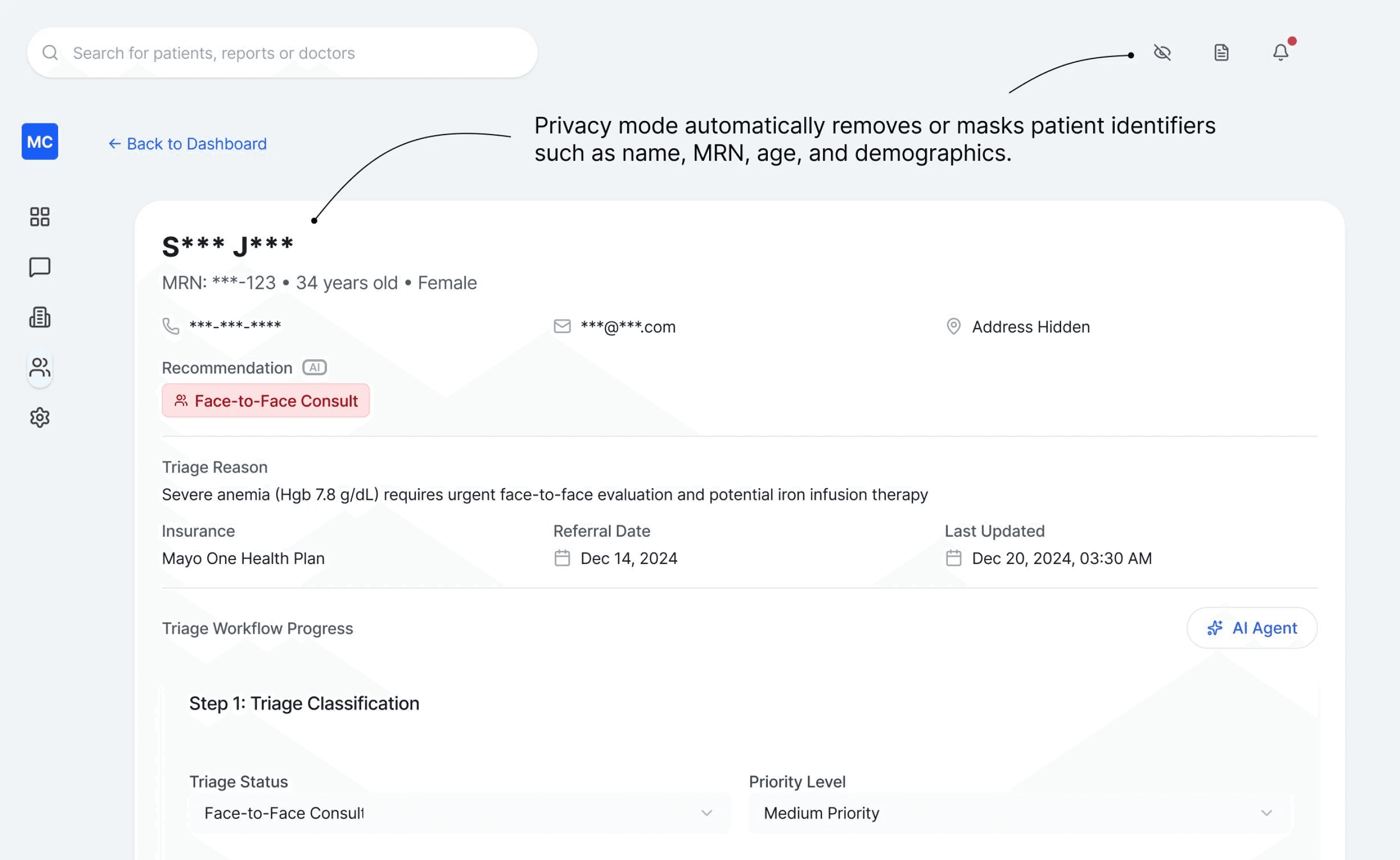 This feature surfaces a transparent breakdown of why a triage decision was made. It links recommendations to clinical guidelines, highlights key decision factors, and documents reasoning in plain language. The goal is trust and auditability, not blind faith in an algorithm doing mysterious things.